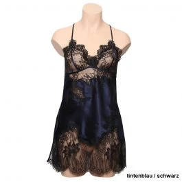 Ein kurzes Negligé der Luxusklasse ist das Seidennegligé Chantage der französischen Edel-Marke Marjolaine. Der edle Seidensatin wurde mit exquisiter Spitze zu einer aufregenden Nachtwäsche verarbeitet.