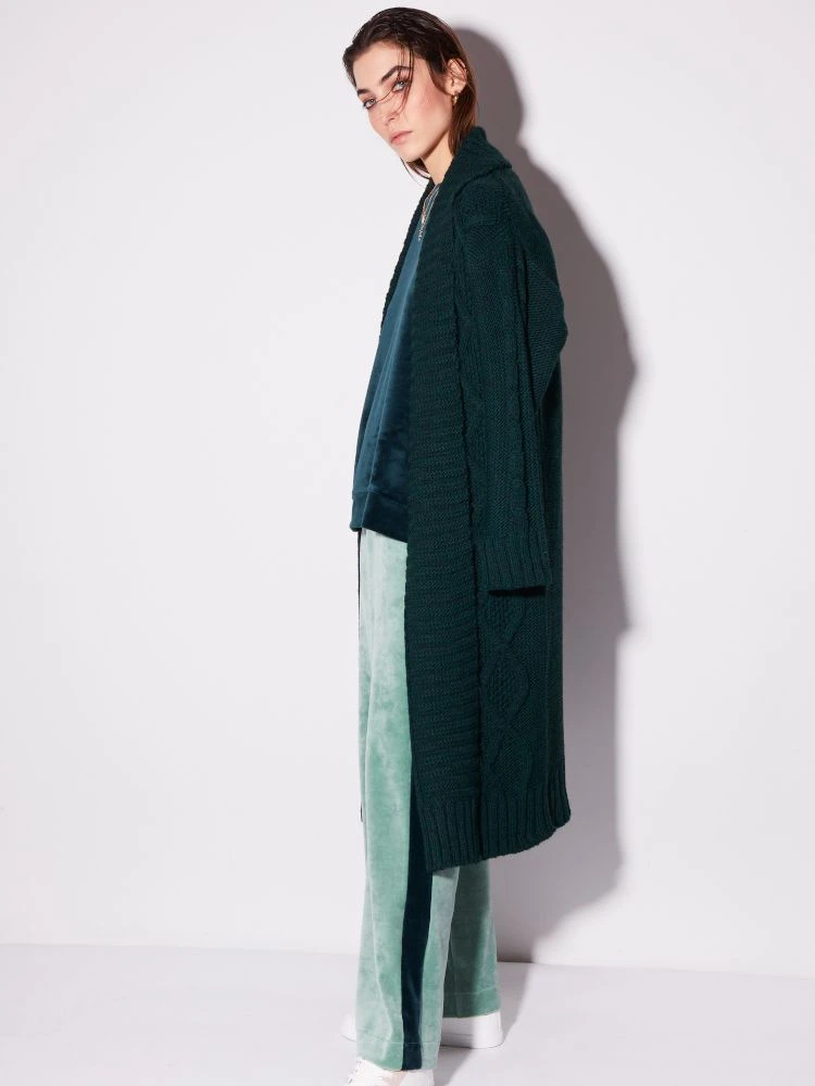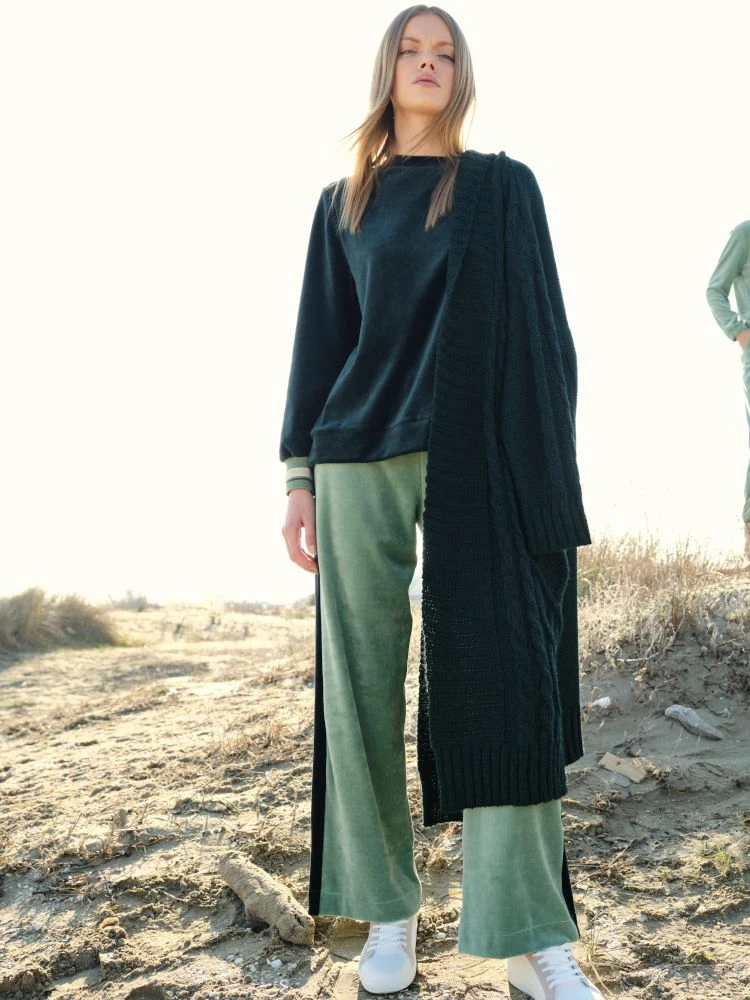 Das Loungewear-Set mit langen Ärmeln und Beinen ist in einer dunkel-/ hellgrün Mischung erhältlich. Das Oberteil ist ca. 60 cm lang und hat lange Ärmel, welche am Bündchen mit Glitzer verziert sind. Die Besonderheit dieses Lounge-Sets besteht in der modernen Zusammensetzung von Ober- und Unterteil. Das Oberteil wird durch den waldgrünen Streifen an der Hose farblich wieder aufgenommen. So wird eine Verbindung zwischen den zwei unterschiedlich gefärbten Teilen geschaffen. Die Hose besitzt einen elastischen Gummizug und ein weites Bein. Dieser modische Hausanzug ist optimal für die Übergangszeit so wie den Winter und kann als Homewear oder auch als Reise- und Freizeitbekleidung getragen werden.