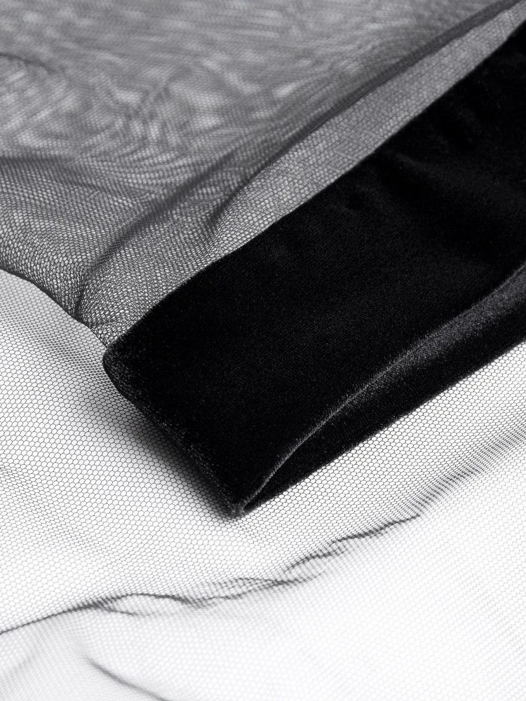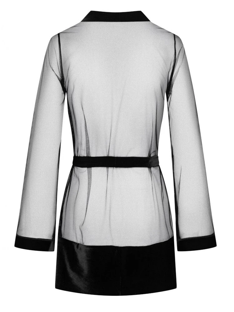 Der Tüll Morgenmantel Kimono Tulle von Cadolle ist ein eleganter Hauch von Nichts… Der kurze Langarm Morgenmantel besteht aus kräftigem, schwarzem Tüll und ist am Revers, Saum und den Ärmelenden mit einer Samt-Borte besetzt. Der Morgenmantel ist ungefüttert und daher transparent. Er ist ca. 80 cm lang, hat lange Ärmel und einen Bindegürtel.