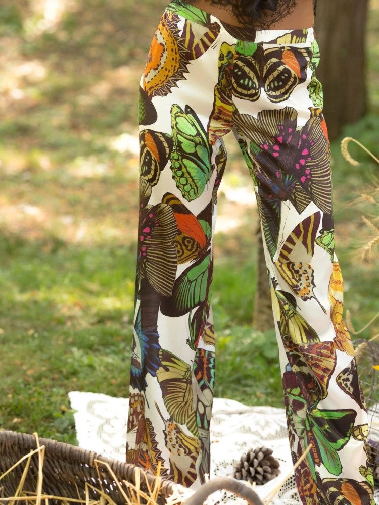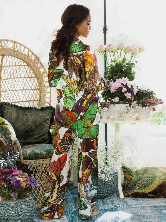 Der lange Seidenpyjama Maya der französischen Luxus-Marke Marjolaine ist aus glänzendem Seidensatin (Stretchseide mit 92% Seide, 8% Elasthan) gefertigt. Das edle Material fällt weich und fließend und ist angenehm auf der Haut. Der Satinstoff glänzt elegant und hat ein modisches Muster von Schmetterlingen auf creme-weißem Grund mit einer grünen Biese.