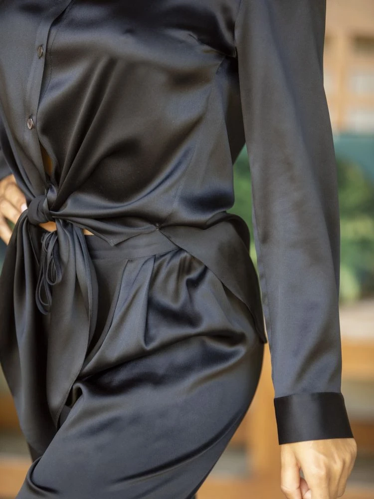 Dieser Luxus Seidenschlafanzug hat eine durchgehende Knopfleiste und Manschetten mit Knopf an den Ärmelenden. Er ist in kobaltblau, schwarz oder terrakotta braun erhältlich. Das Oberteil ist ca. 68 cm lang und wird vorne unten mit einem modischen Bindeknoten gebunden.